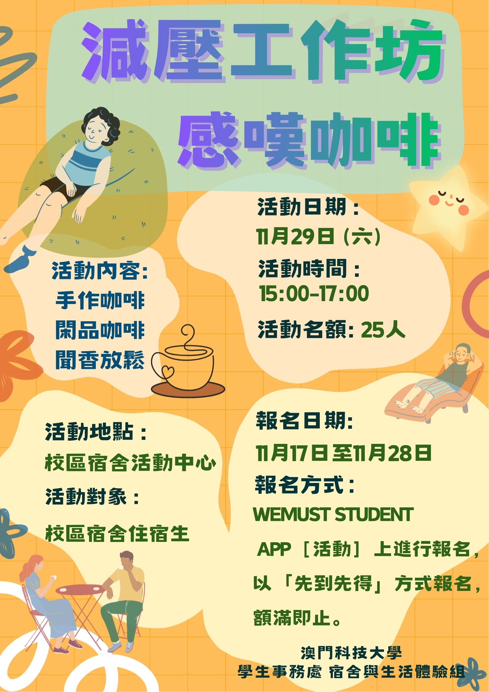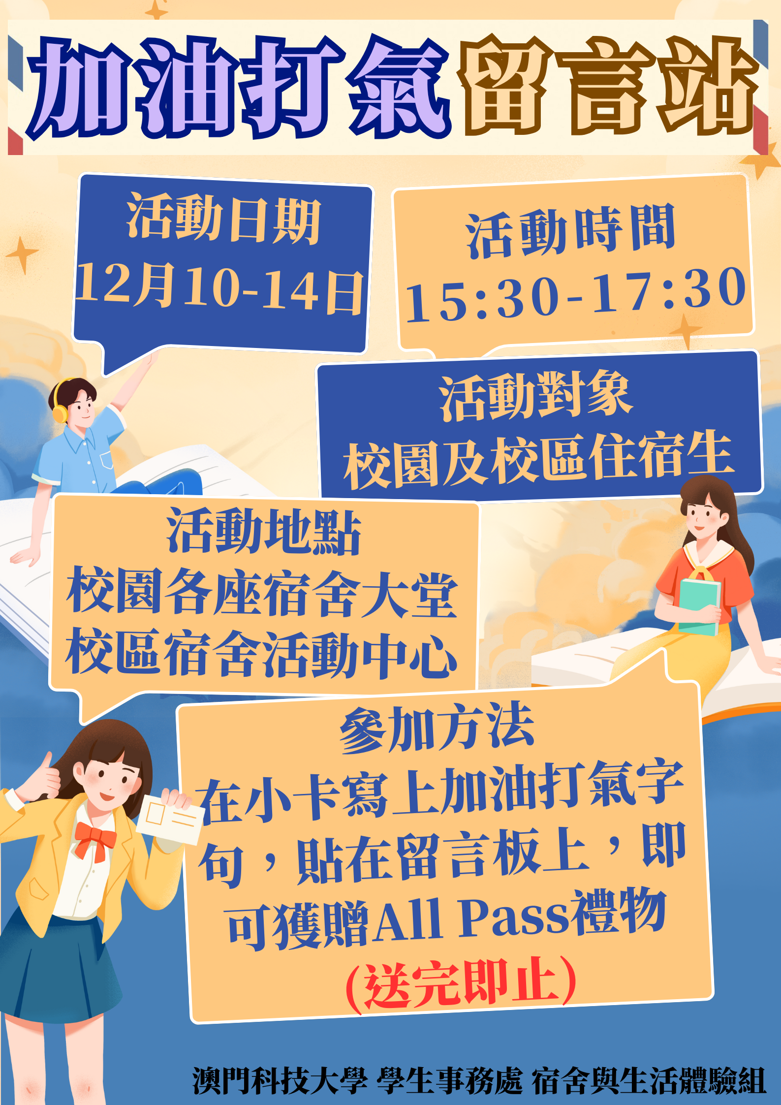 致 全体学生:活动将于12月5日至7日在凼仔龙环葡韵举行,并以“悦读假期”为主题,现场设户外图书馆、艺文书展、星空电影院、咖啡及文创市集、艺文表演、疗愈工作坊等,费用全免,欢迎各位同学到场参与。学生事...