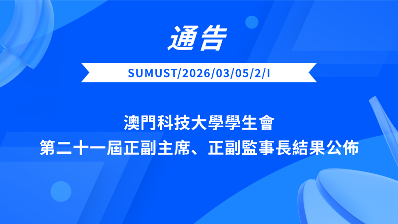 SUMUST/2026/03/05/2/I內部通告事由:澳門科技大學學生會第二十一屆正副主席、正副監事長結果公佈根據學生會章程和換届委員會的安排,學生會已於2026年3月4日在O座604課室順利召開澳...