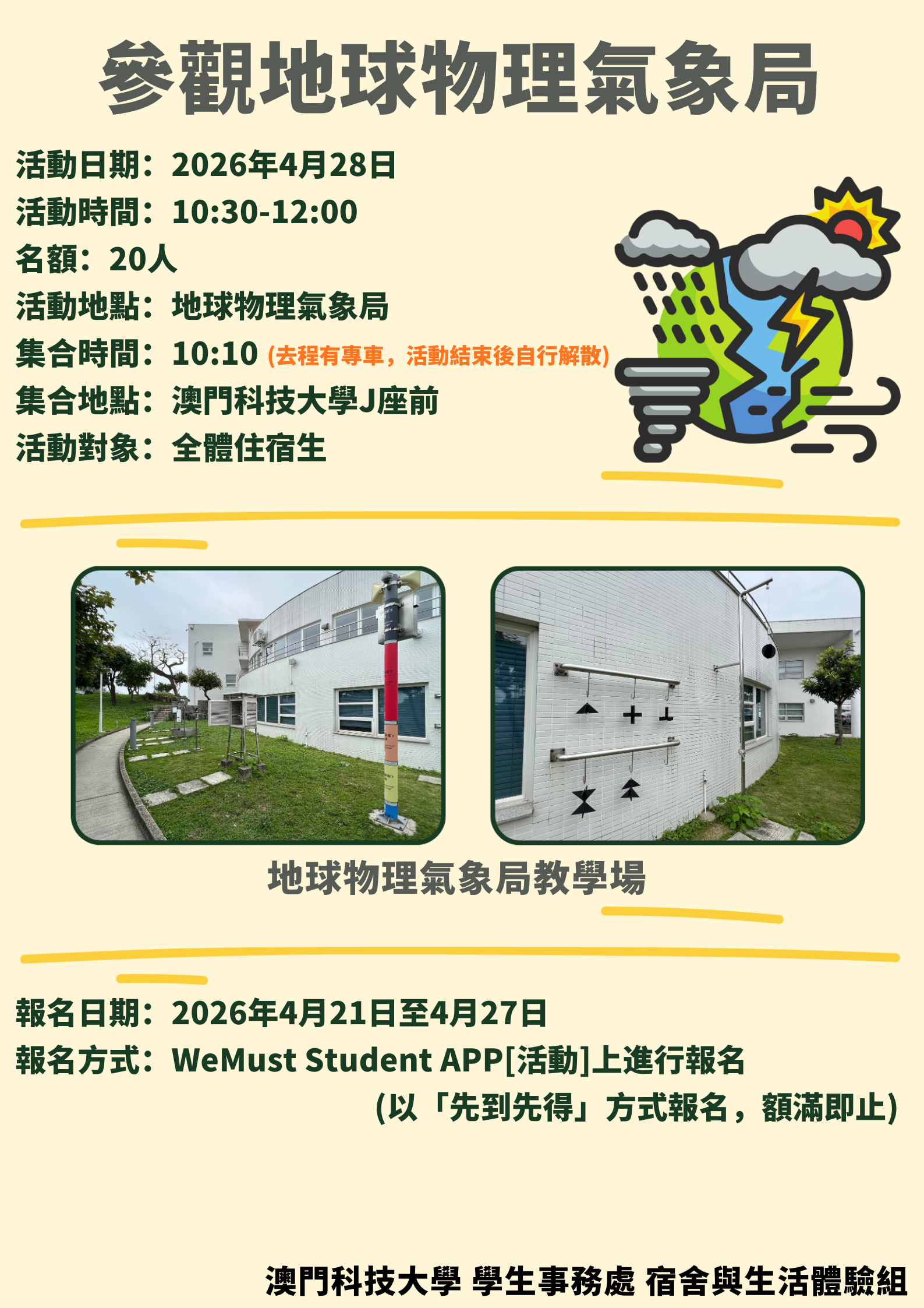 致全體學生:為慶祝五·一勞動節及讓本澳學生加深對中國人民解放軍駐澳門部隊的認識,2026年“中國人民解放軍駐澳門部隊氹仔軍營開放日”學生專場活動現正接受報名,有關活動安排如下:活動詳情:活動日期:20...