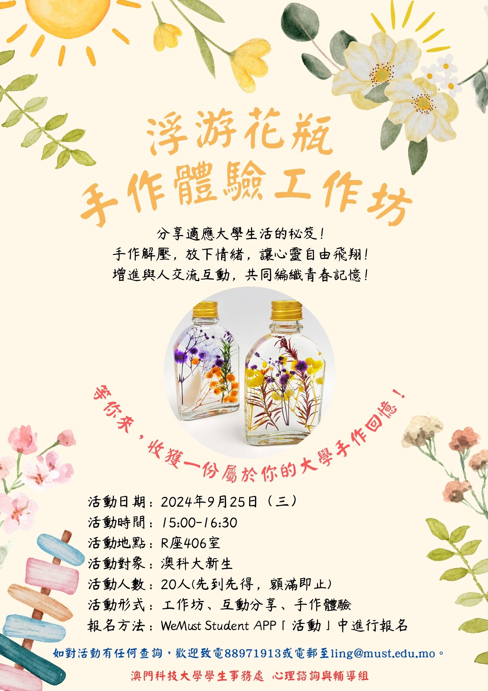 活动:快乐花园工作坊日期:2025/3/7(星期五)时间:15:30-17:30地点:R405对象:澳门科技大学学生报名方式:WeMust Student APP「活动」中进行报名(报名后需回复确认电...
