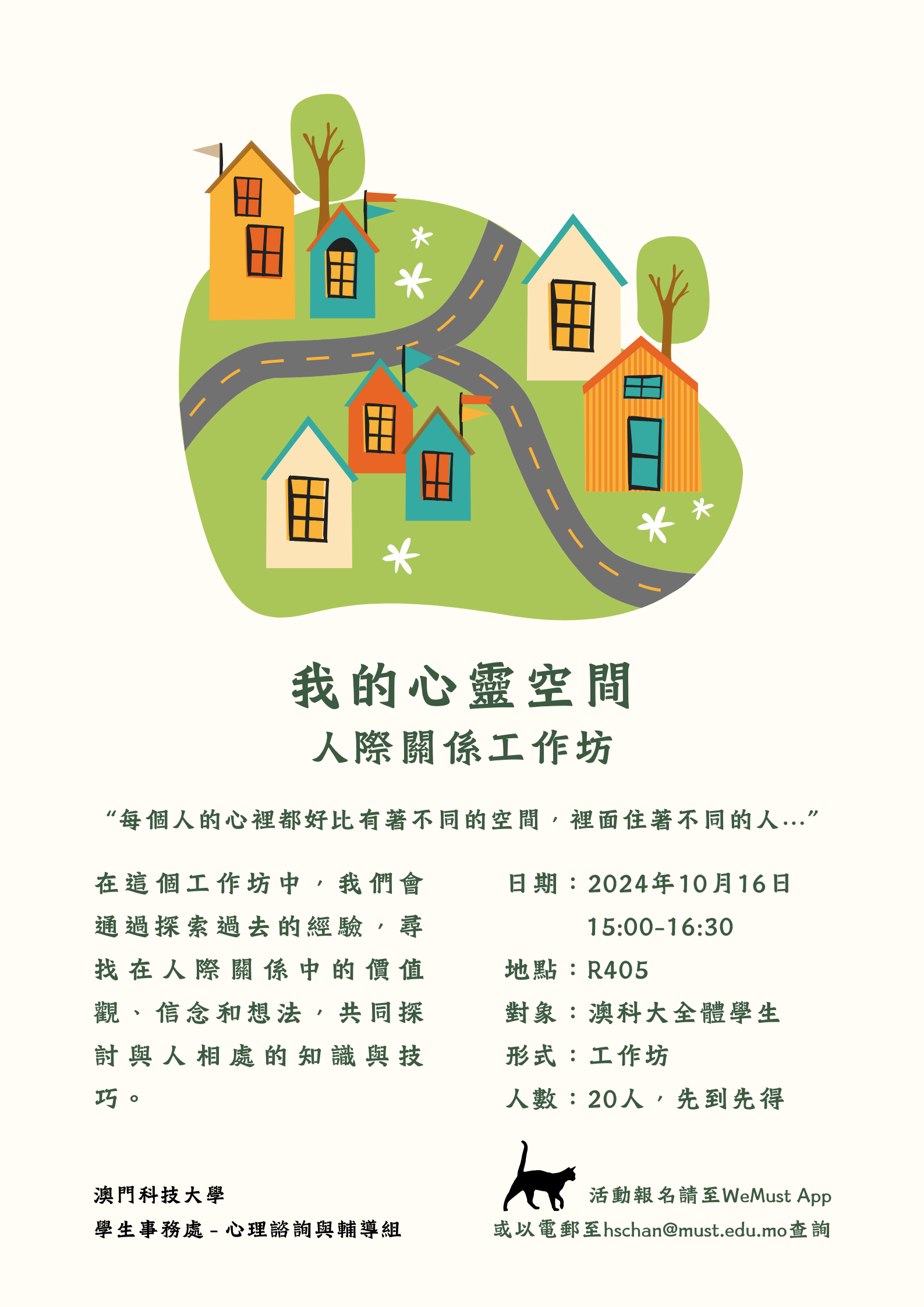 活动資訊活动日期:2024年9月25日(三)活动时间:15:00-16:30活动地点:R座406室活动对象:澳科大新生活动人数:20人(先到先得,额满即止)活动形式:工作坊、互动分享、手作体验报名方法...