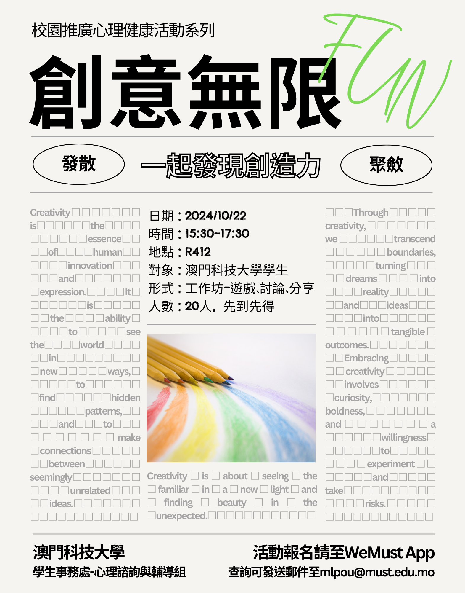 活动訊息活动名称:创意无限Fun工作坊活动日期:2024/10/22(星期二)活动时间:15:30-17:30活动地点:R412活动对象:澳门科技大学学生活动形式:游戏、讨论、分享活动人数:20人活动...
