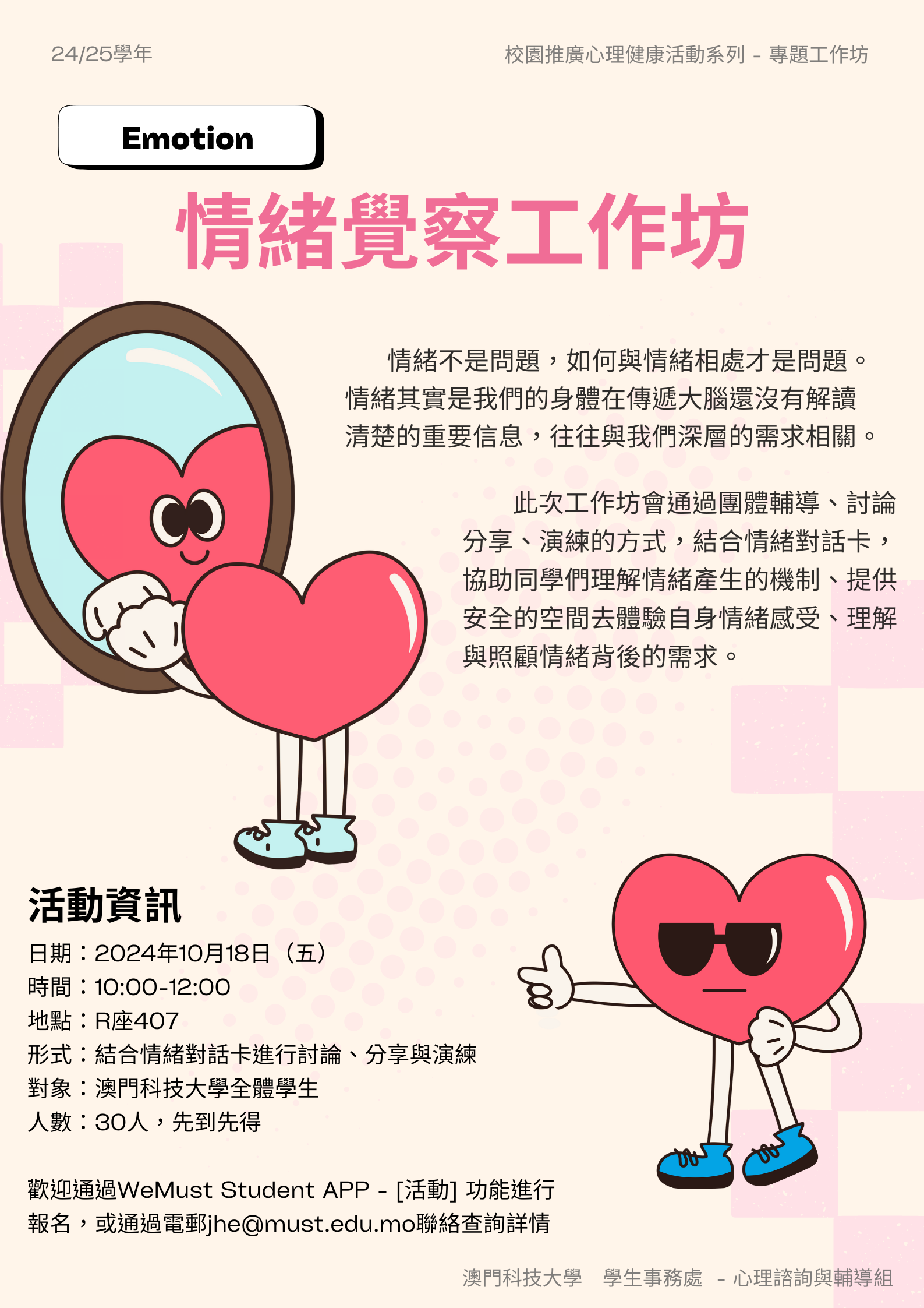 活动资讯活动日期:2024年10月18日(五)活动时间:10:00-12:00活动地点:R座407室活动对象:澳门科技大学全体学生活动人数:30人(先到先得,额满即止)活动形式:结合情绪对话卡进行讨论...