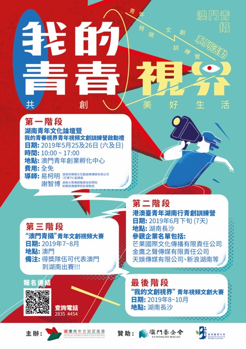 為推動湘澳兩地文化產業發展,並聚合兩地青年力量,同時為本澳有意從事視頻文創領域的青年提供一個學習及發揮潛能的機會,由湘澳青年交流促進會主辦,湖南省人民政府多個單位組織及支持,以「澳門青攝」為主題之系列活動,現正進行第一階段之【湖南青年文化論壇 暨 我的青春視界青年視頻文創訓練營啟動禮】報名;另有第二階段的訓練營(6月下旬)報名及第三、最後階段的視頻大賽和視頻文創大賽,詳情可參考活動海報。歡迎有興趣的學生報名參加,詳情如下: