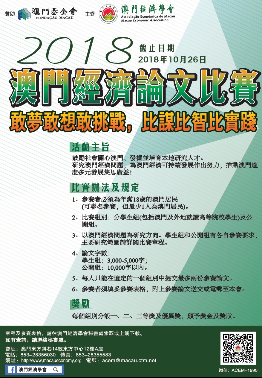活動消息:2018年澳門經濟論文比賽