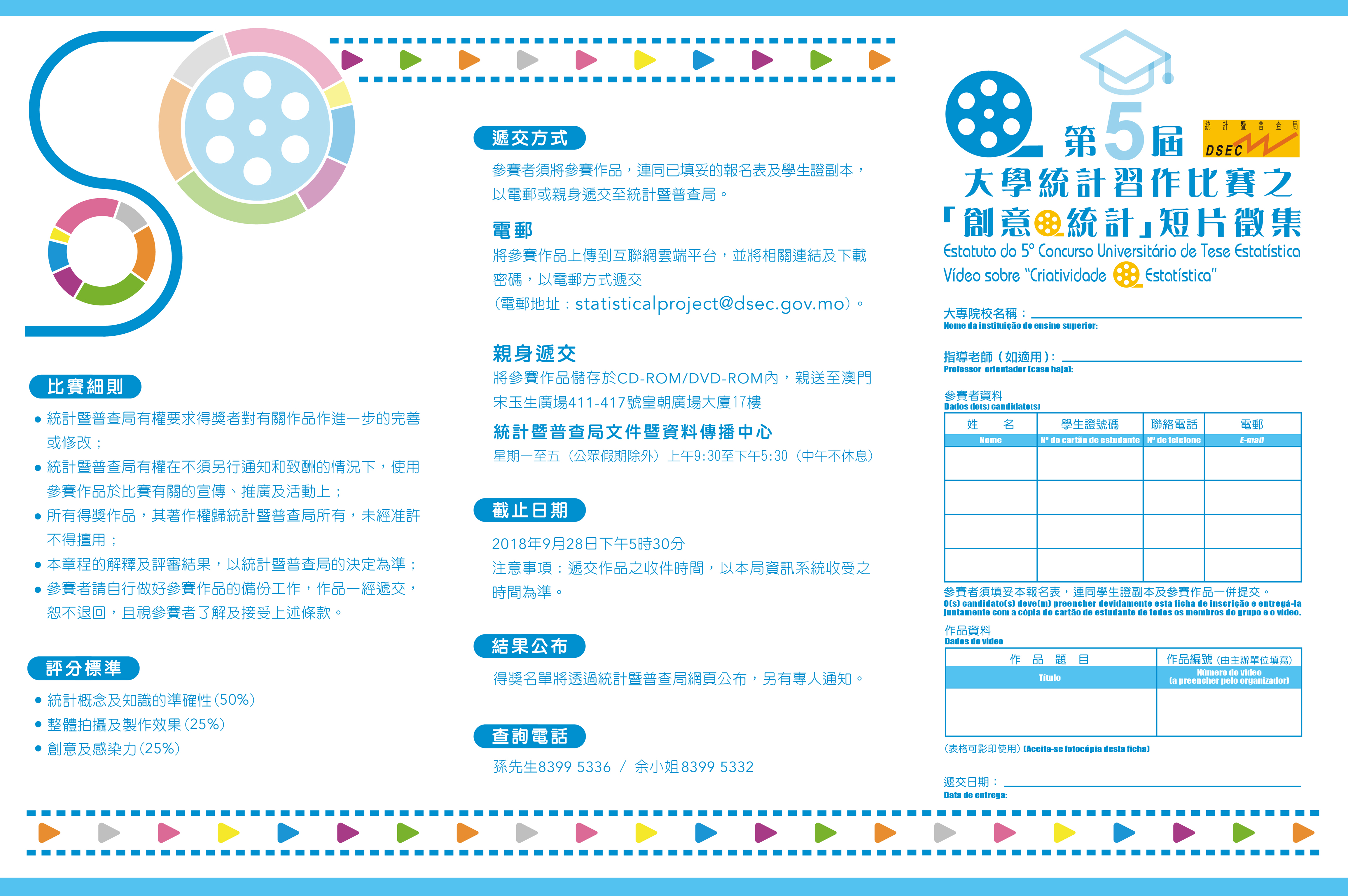 為提升大學生對統計數字的興趣,並鼓勵他們透過統計數字及科學方法認識澳門,統計暨普查局現正進行第五屆大學統計習作比賽之「創意‧統計」短片徵集比賽。徇眾要求,比賽作品遞交截止日期延長至9月28日下午5時止。