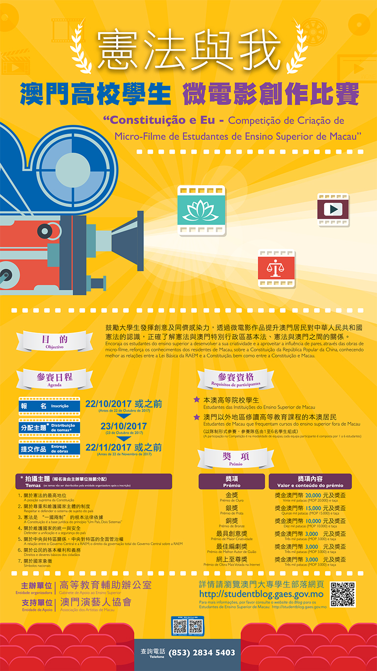 憲法與我─澳門高校學生微電影創作比賽將於10月22日截止報名,有興趣者歡迎留意以下訊息。