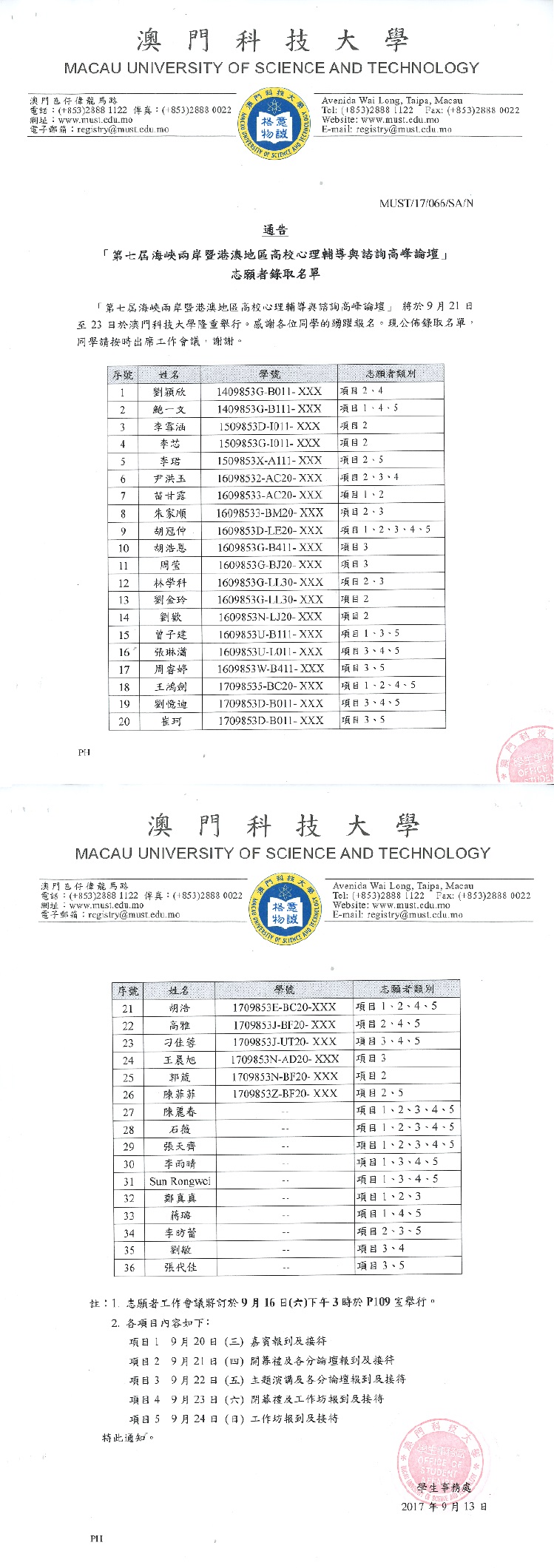 「第七屆海峽兩岸暨港澳地區高校心理輔導與諮詢高峰論壇」 將於9月21日至23日於澳門科技大學隆重舉行。感謝各位同學的踴躍報名。現公佈錄取名單,同學請按時出席工作會議,謝謝。