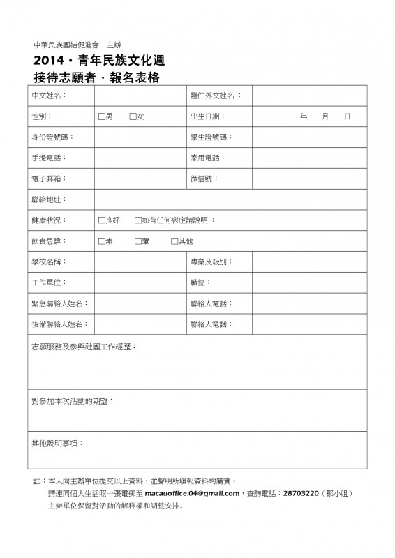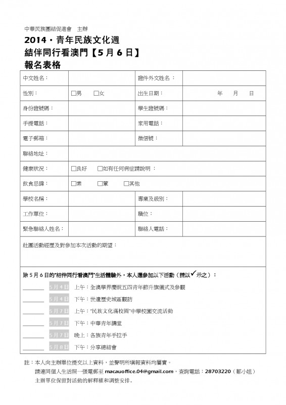 招募對象:18歲至30歲的本澳大專學生及社會青年 報名日期:即日起至4月22日止 報名方式:參考有關章程並填妥報名表,連同一張個人生活照,電郵至macauoffice.04@gmail.com |