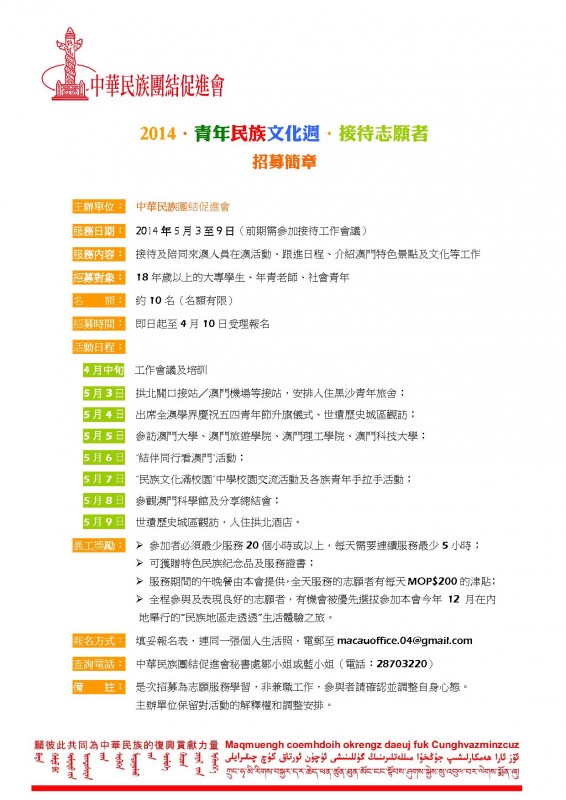 「2014青年民族文化週」現招募學生,帶領前來澳門的中國內地6所少數民族院校及台灣地區共70名各民族青年的大學生,進行「結伴同行看澳門」的一系列活動,讓各地少數民族青年能加深對澳門中西文化交融的歷史文化的認識,活動資訊如下: