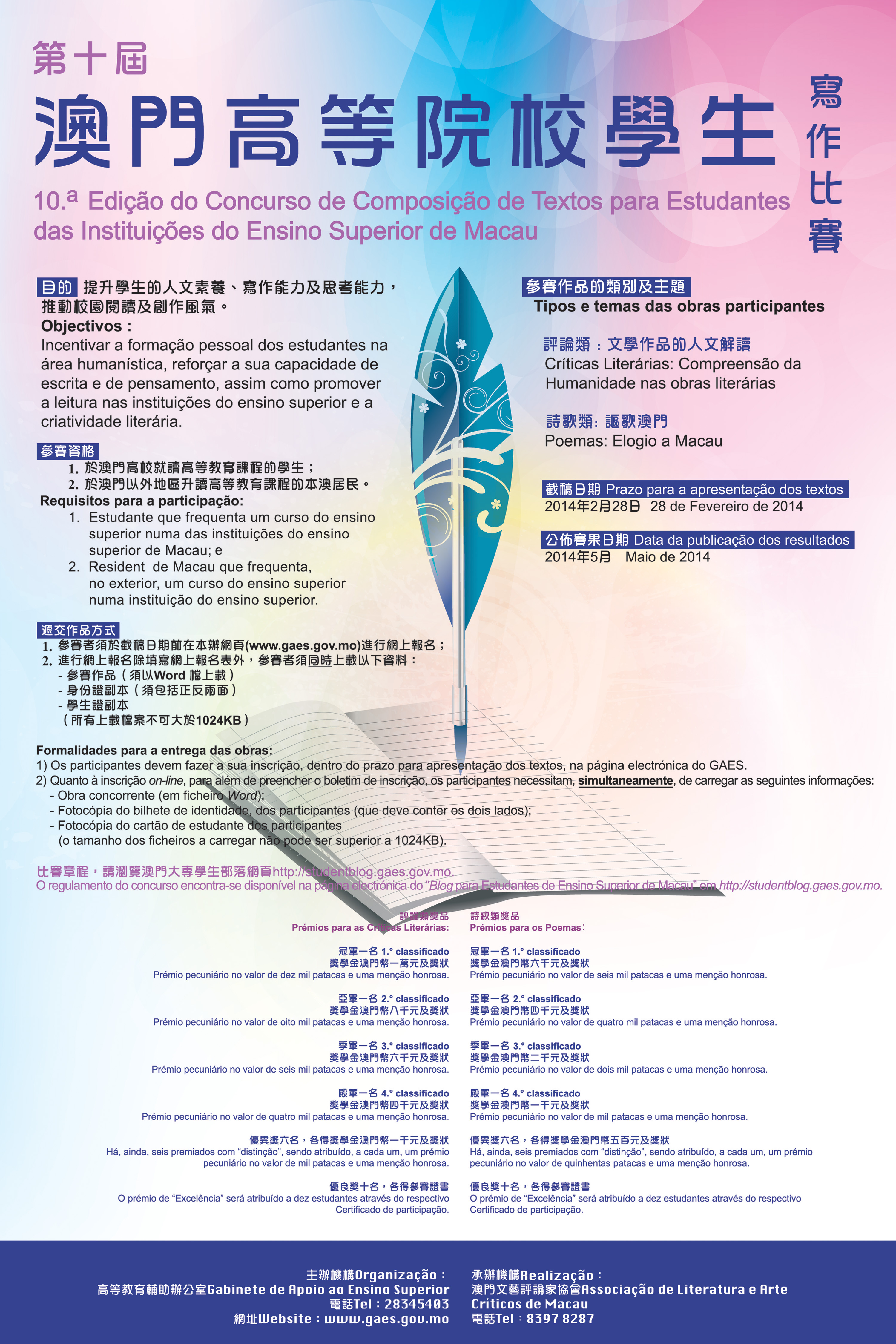 為提升學生的人文素質、寫作能力及思考能力,推動校園閱讀及創作風氣,高等教育輔助辦公室現正舉辦「第十屆澳門高等院校學生寫作比賽」,歡迎有興趣的同學報名參加,活動資訊如下: