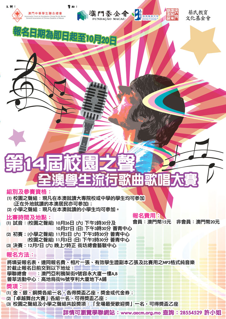 為增加本澳學生的音樂才華,發掘學生的音樂潛能,給具有音樂才能的學生能夠發揮其所長,使學生能在學習生涯上得到全面的發展。由澳門中華學生聯合總會主辦的「第十四屆校園之聲全澳學生流行歌曲歌唱大賽」現在接受報名,歡迎有興趣的同學參加。詳情如下: