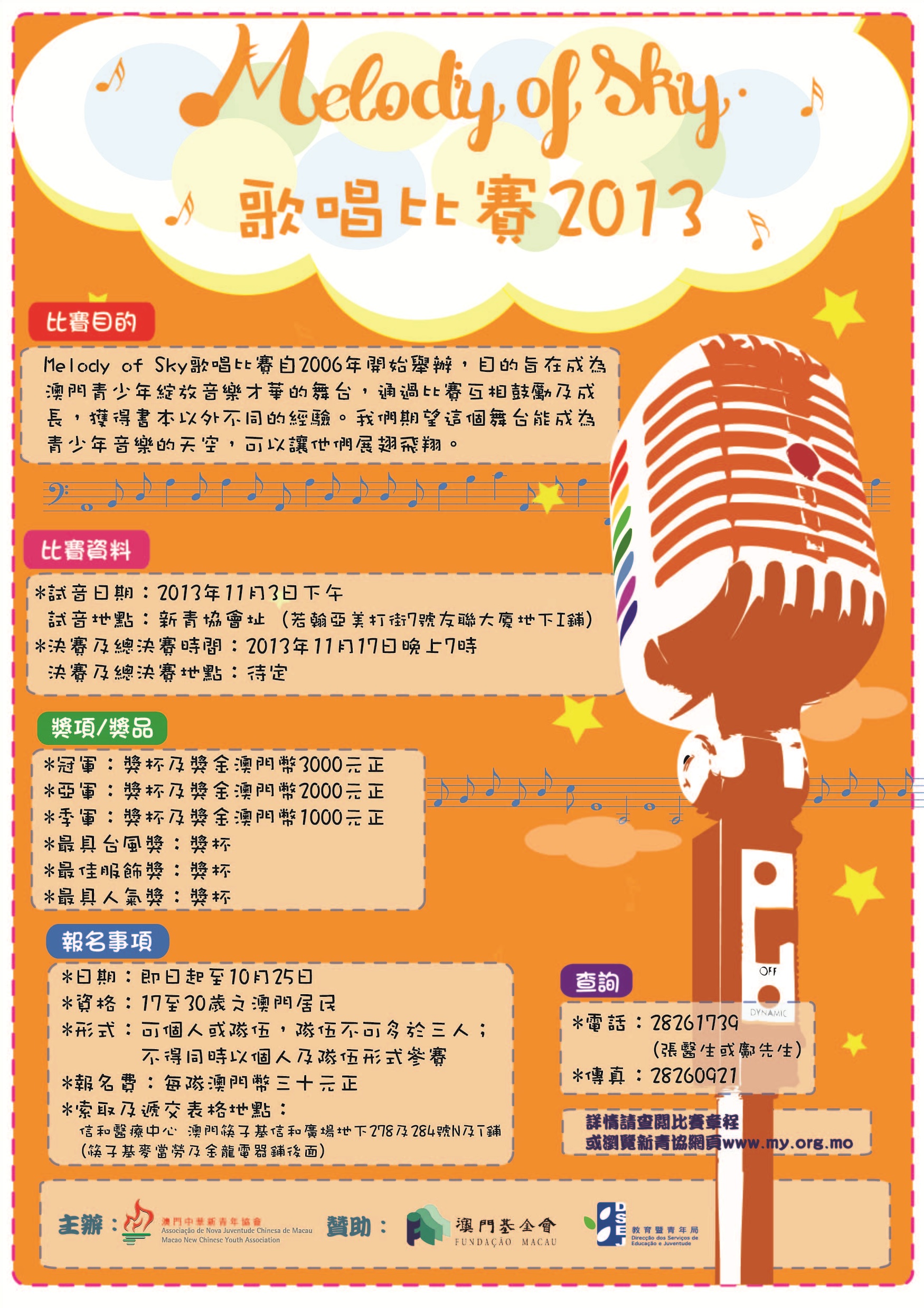 為讓澳門青少年有一個綻放音樂才華的舞台,並通過比賽互相鼓勵及成長,獲得書本以外不同的經驗,由澳門中華新青年協會主辦的「Melody of Sky」歌唱比賽開始報名,歡迎有興趣的同學參加。詳情如下: