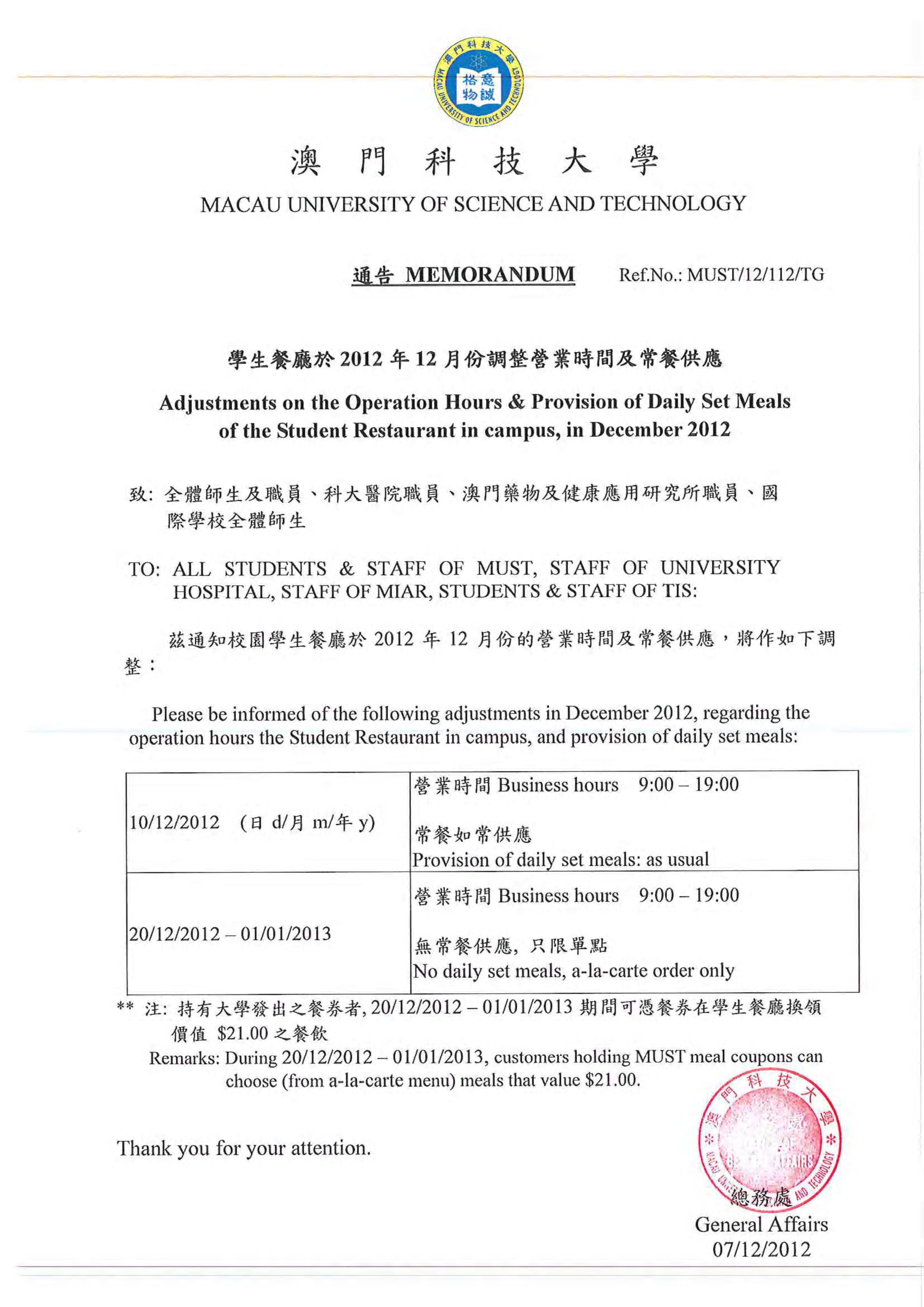通告 學生餐廳於2012年12月份調整營業時間