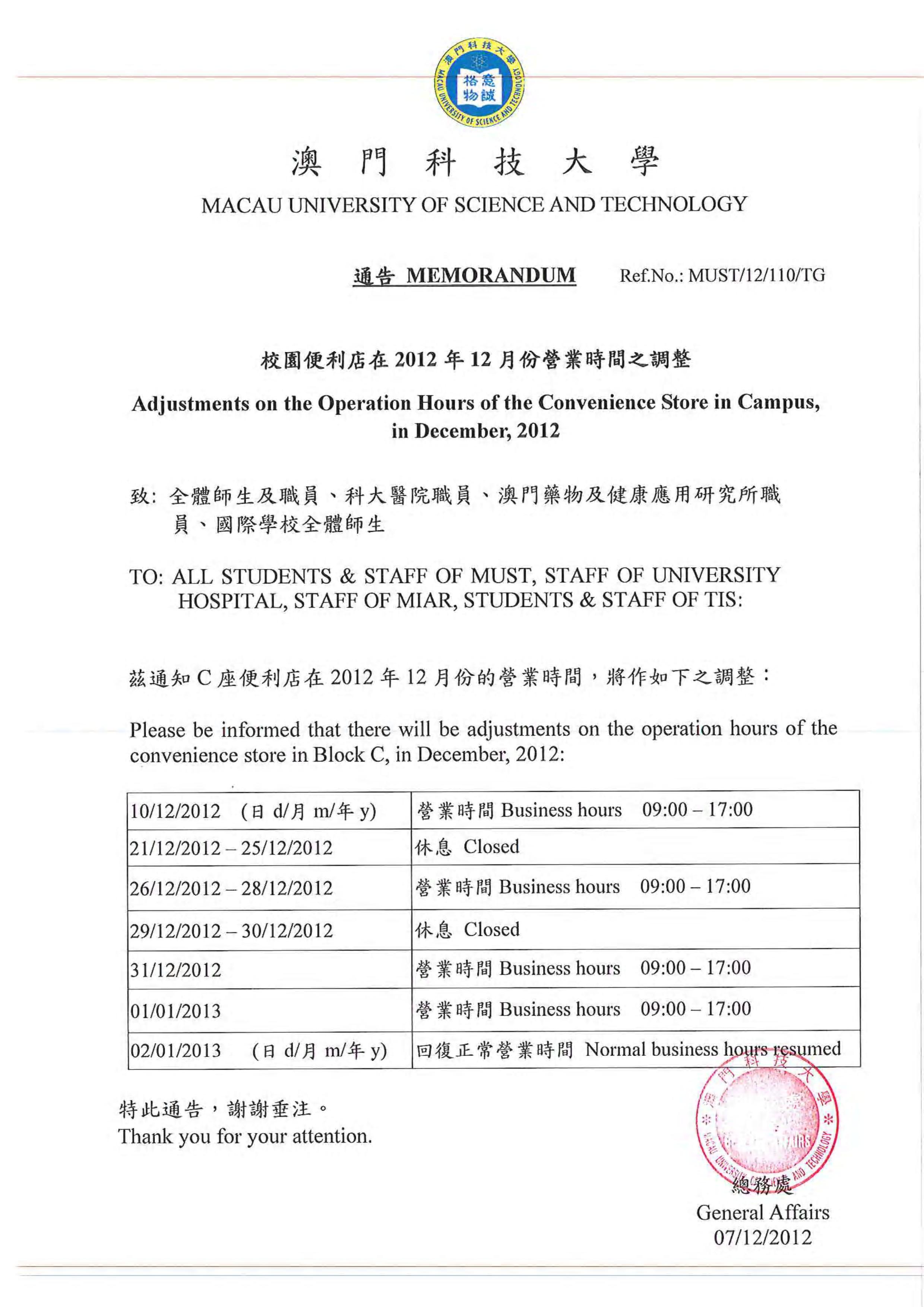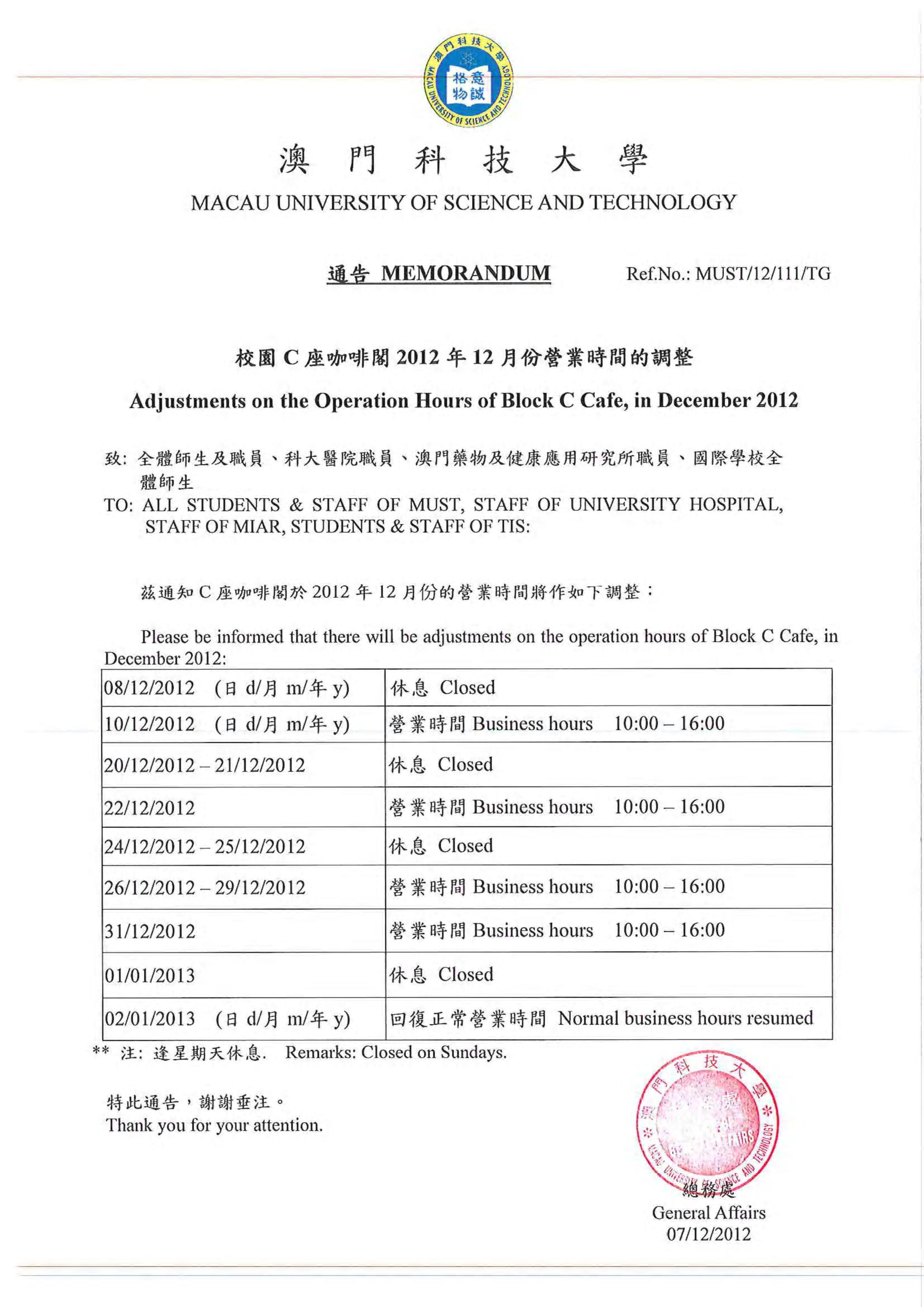 發佈消息:學生餐廳/校園便利店/C座咖啡店 – 2012年12月份營業時間之調整通告
