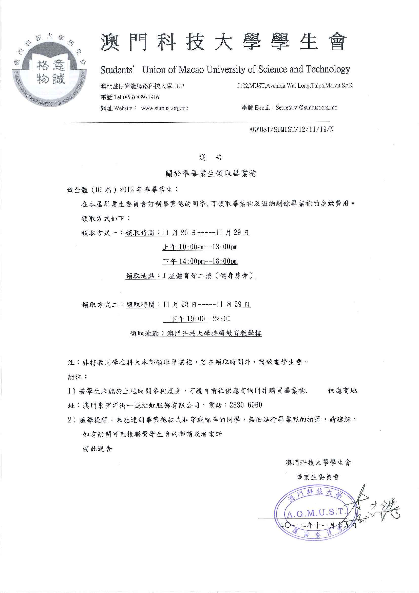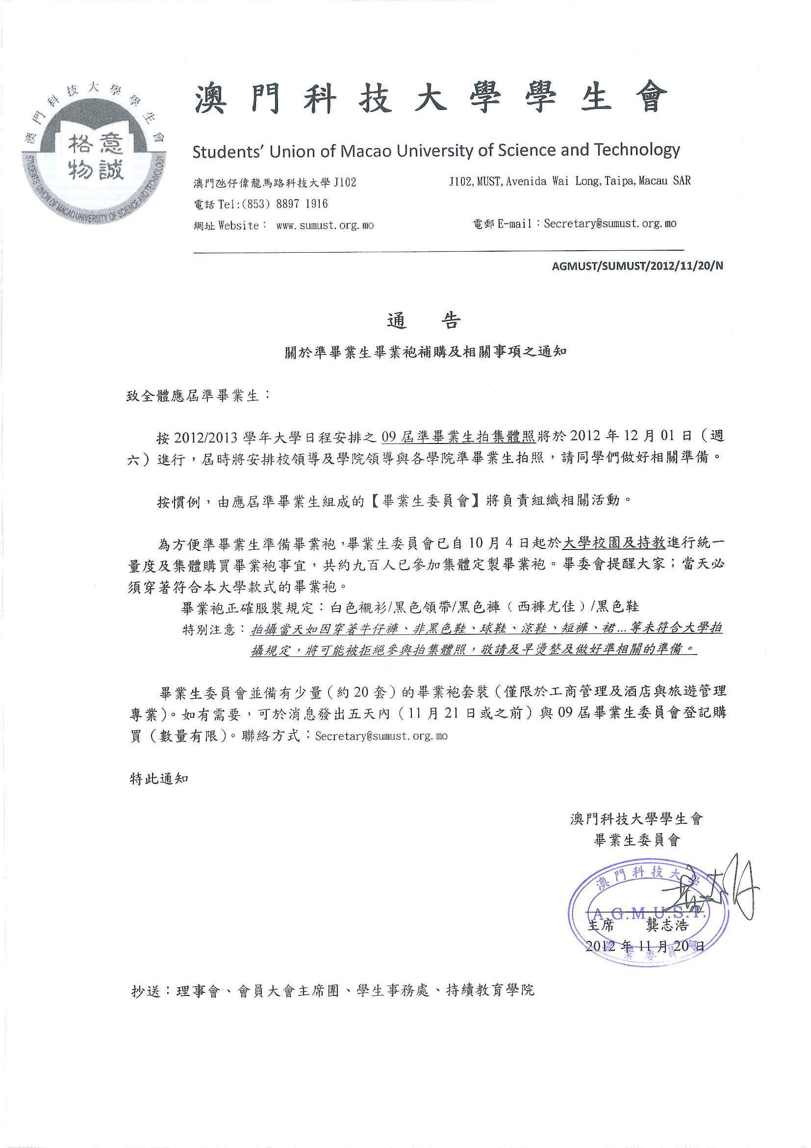 發佈消息:畢業生委員會領袍通知