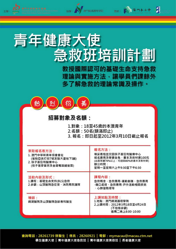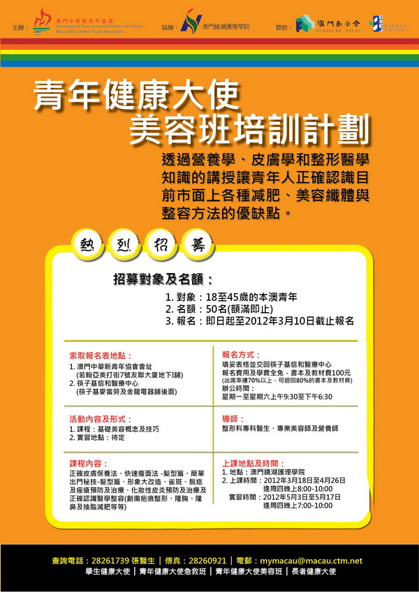 由澳門中華新青年協會舉辦之2012年“健康促進系列活動”現正開展,活動內容包括各興趣班、互動講場,歡迎有興趣的同學參加。