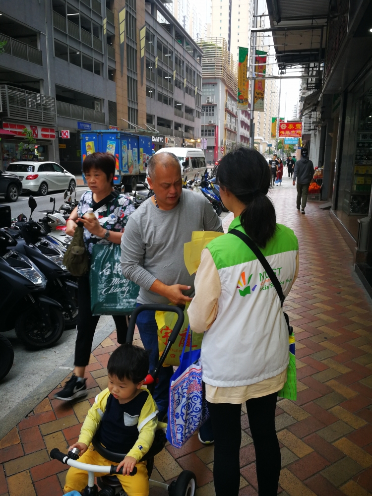 社会服务队队员一连两日,分别在黑沙环、筷子基、氹仔等社区参与卖旗活动。队员们带著大会的旗袋及义卖物品,一路上得到许多市民的热情支持,慷慨解囊。义卖活动结束后,队员们也自掏腰包购买由扶康会学员创作的环保袋和文件袋,一起捐出自己的一份爱心,希望给更多的残障人士带来希望。