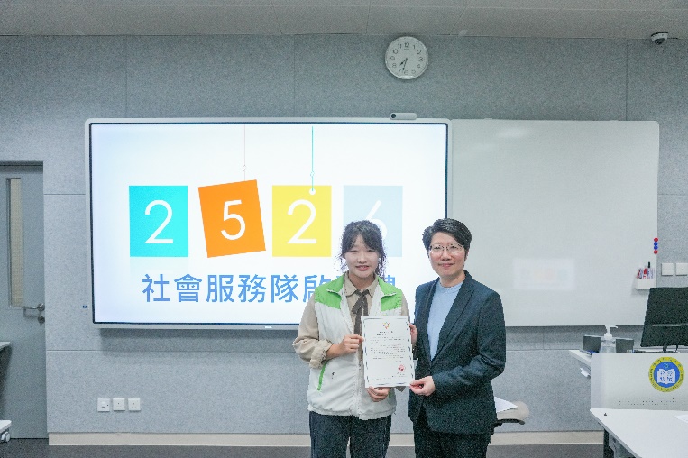 在黃處長的見證下,主持人帶領全體隊員進行了莊嚴的宣誓儀式,並舉行了激動人心的25/26學年社會服務隊頒獎典禮,鏗鏘有力的誓言回蕩全場,彰顯出新一屆隊員投身社團服務的決心與信念。儀式最後,全體成員共同拍攝大合影,以影像方式定格了這一具有紀念意義的時刻。新隊員們紛紛表示,通過此次活動,不僅加深了彼此的認識,更深刻感受到社服隊所傳遞的歸屬感與凝聚力,對未來的團隊協作與共同成長充滿期待。
