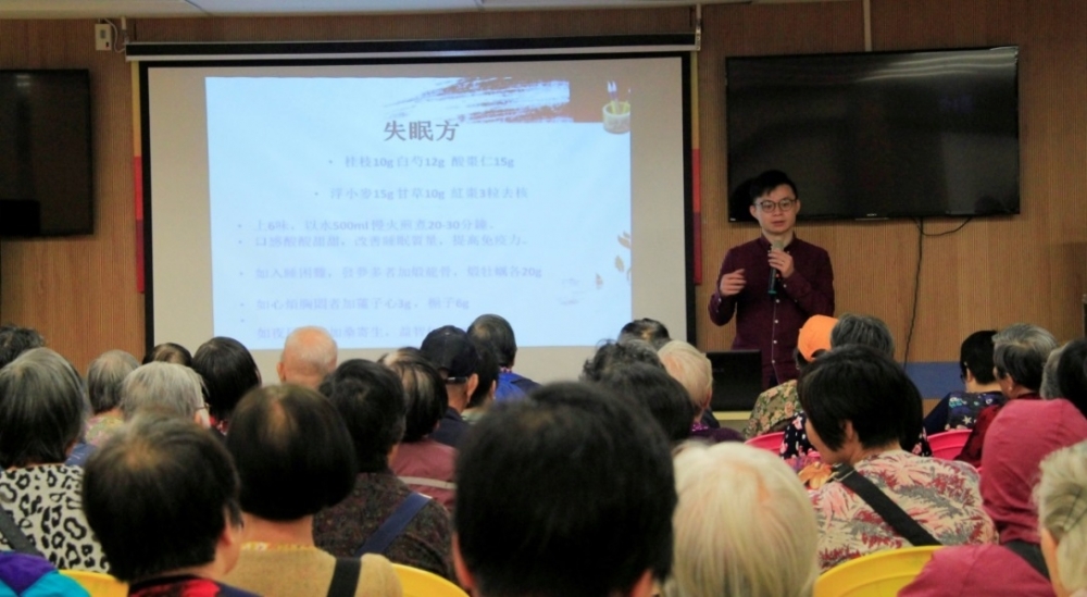 是次探访活动分别为老人按摩服务、养生茶饮品尝和日常保健知识讲座,老人轮流接受按摩服务,而等候按摩的老人则聆听健康知识讲座。进行按摩服务的中医药学院同学均接受了多次规范的推拿按摩培训,同学们认真专注的态度和专业的推拿手法、力度,获得老人的一致赞赏。吴梓拓中医生针对老人常见的失眠、腰痛、咳嗽等不适,介绍简易有效的内外疗法,提供药食同源的养生饮食建议,老人们听得十分入神,踊跃提问,现场气氛热烈。在讲座过程中,社会服务队同学分别送上现场煲制的养生茶饮(搭配茶点)供老人品尝。两款茶饮分别是第六届、第七届中医药学院耆康爱心汤料编制比赛最佳茶饮奖作品,其中四君子茶(梅)理气安神、玫瑰菊花养肝茶补肝肾,均适宜当下澳门季节和天气情况。此外,活动还为老人准备了的中药香包,随身携带可以起到化湿醒神的作用。活动最后,澳科大师生向老人们赠送了由中医药学院同学编制的《耆康爱心汤料餐单》、《澳门老人日常养护指南》以及科大医院特别赠送的UHealth书册,受到了老人的喜爱。是次活动有八十多名老人出席,有社会服务队队员表示,是次的活动让同学们深入到基层社区,透过给老人们按摩、煲制养生茶饮,能够真正的了解到老人们的需求。同时和中医药学院的同学们合作使得整个活动更具专业性,各自发挥专业所长,共同为关爱老人贡献自己的心力,是一次特别又有趣的探访经历。