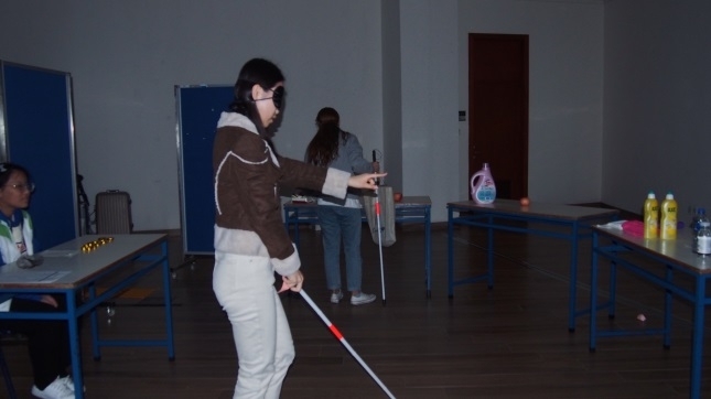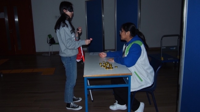活動設置多個環節並盡可能還原盲人生活情景。在活動中,體驗者需戴上眼罩,手持導盲杖,在佈置好的區域裏按要求完成「走盲道」、「超市購物」、「過馬路」、「看電影」這四個環節並完成各環節的相應任務。