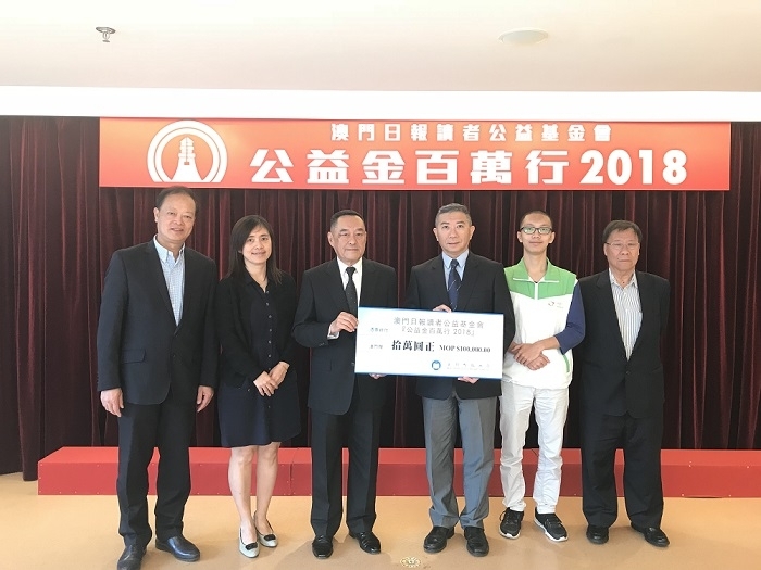 澳门科技大学教职员工、学生、校友会成员及科大医院员工,合共筹得澳门币十万元,并于12月6日由澳科大邝应华协理副校长、学生事务处谭洁玲助理行政主任、社会服务队队员吴旻聪同学等一行3人至澳门日报读者公益基金会进行支票捐赠仪式。
