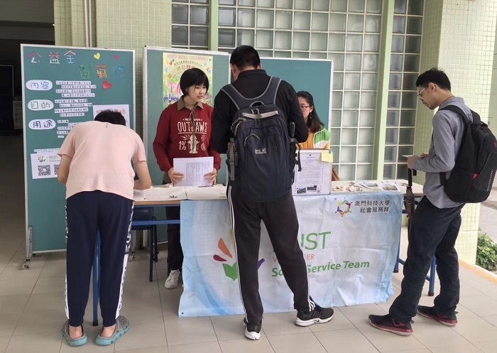 由澳门日报读者公益基金会主办「公益金百万行2018」,澳门科技大学师生一如既往积极参与。学生事务处辖下社会服务队与创行团队于11月26日至28日期间分别于N座及B座大堂设置义卖摊位。社会服务队队员们今年依然利用自身才艺,以手作热缩胶片、义卖大学纪念品等形式募集善款。此外,中医药学院学生会举办的杏园廊庭系列活动之“中医凉茶”义卖,以及学生会话剧社举办的年度话剧《今晚无人入眠》亦设置筹款箱,共同为百万行筹集善款。透过各学生社团成员们的努力不懈宣传义卖,合共筹得约澳门币4,254.5元、人民币470元及港币179元善款。