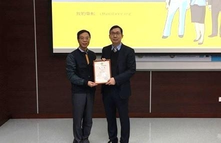 澳科大校友會聯合總會秘書長馮鈞國向主講嘉賓韓子天博士(右)致送感謝狀