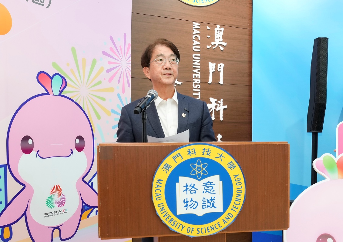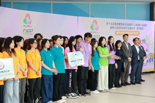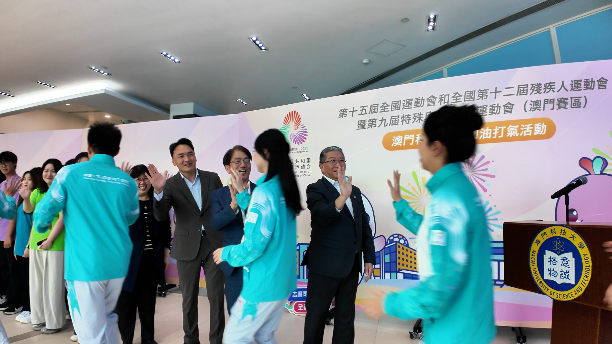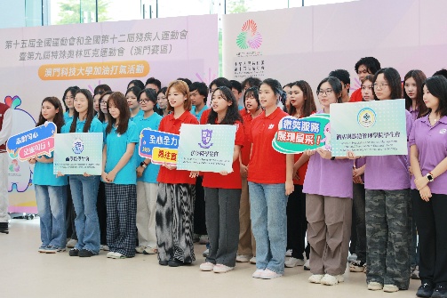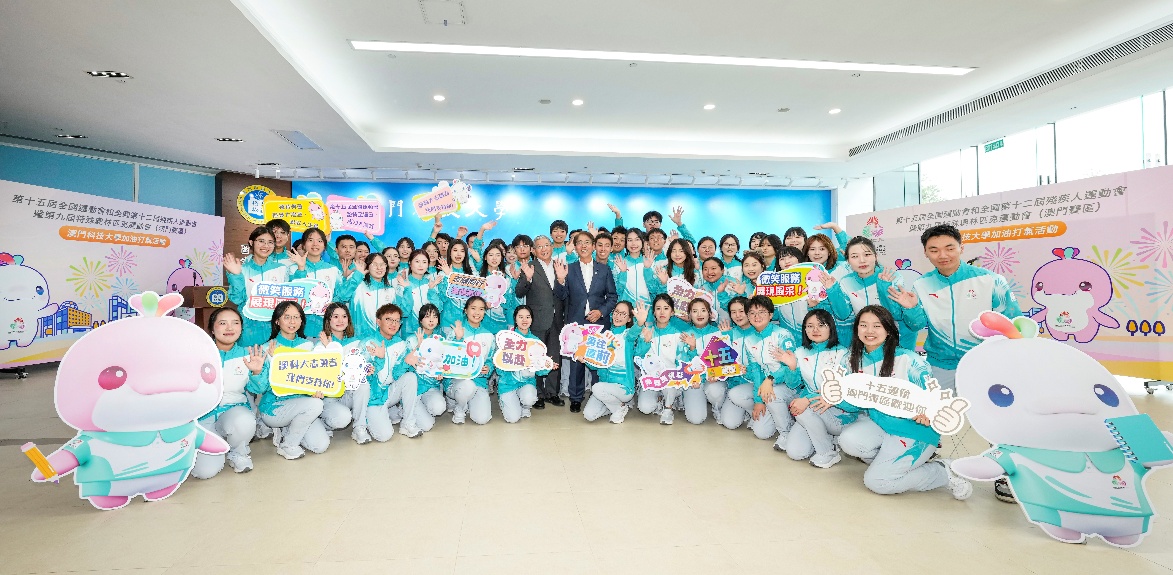 「第十五届全国运动会及全国第十二届残疾人运动会暨第九届特殊奥林匹克运动会(澳门赛区)」澳门科技大学加油打气活动于2025年10月24日下午假大学N座大堂举行。活动由澳门特区政府教育及青年发展局局长龚志明、副局长阮佩贤,澳科大副校监兼校长李行伟、副校长邝应华共同主礼,旨在全力支持澳门特区政府筹备国家级体育盛事。澳科大志愿者代表、各院所长及行政主管、学生会及各学院学生代表等近300名师生参与。现场气氛热烈,展现了全校师生齐心支持澳门赛区赛事、为志愿者鼓舞士气的坚定信念。