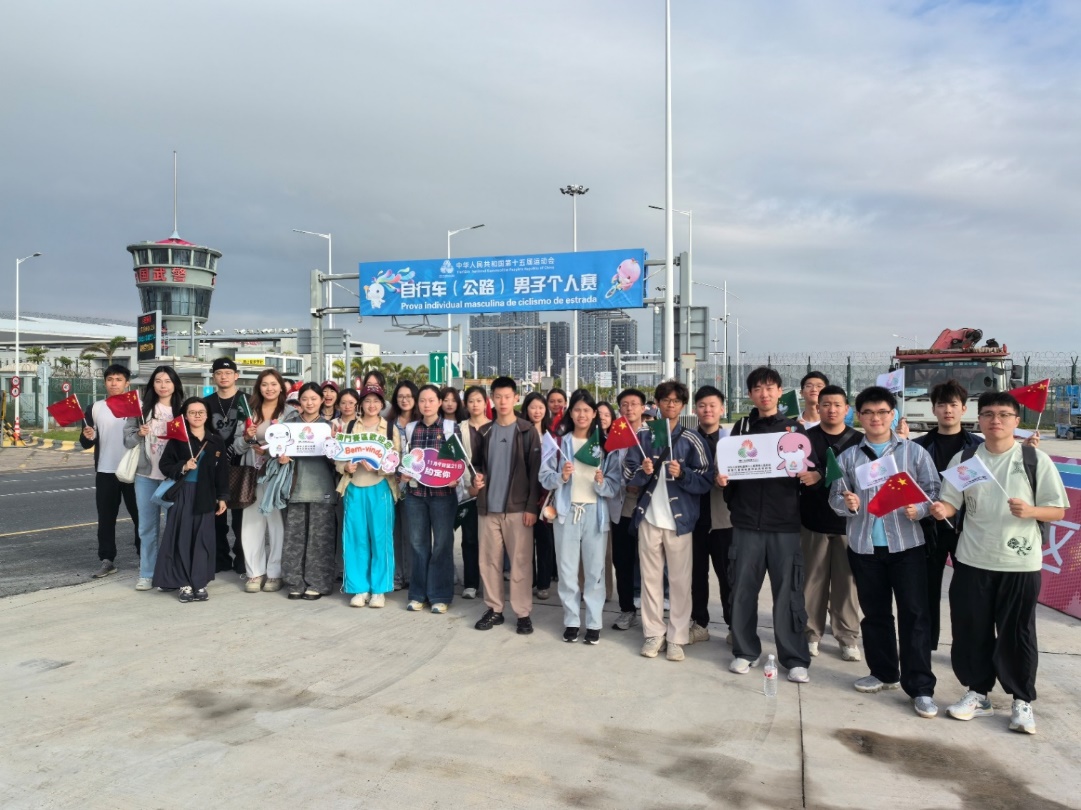 第十五屆全國運動會自行車(公路)男子個人賽於11月8日上午9時由珠海市博物館出發,隨後經港珠澳大橋人工島進入澳門賽區路段賽道,途經澳門大橋,氹仔客運碼頭等地,再折返經港珠澳大橋前往香港,終點設于珠海,全長231.8公里。自行車(公路)男子個人賽是十五運會唯一一項首次跨越粵港澳三地的賽事,爲齊心支持澳門賽區賽事,澳門科技大學組識了全運會志願者、澳門科技大學學生會、學院學生會及屬會成員接近130人的加油打氣團,在上午七時起分批集合,分成三支小隊分別前往港珠澳大橋人工島及北安碼頭兩地,爲運動員加油打氣。