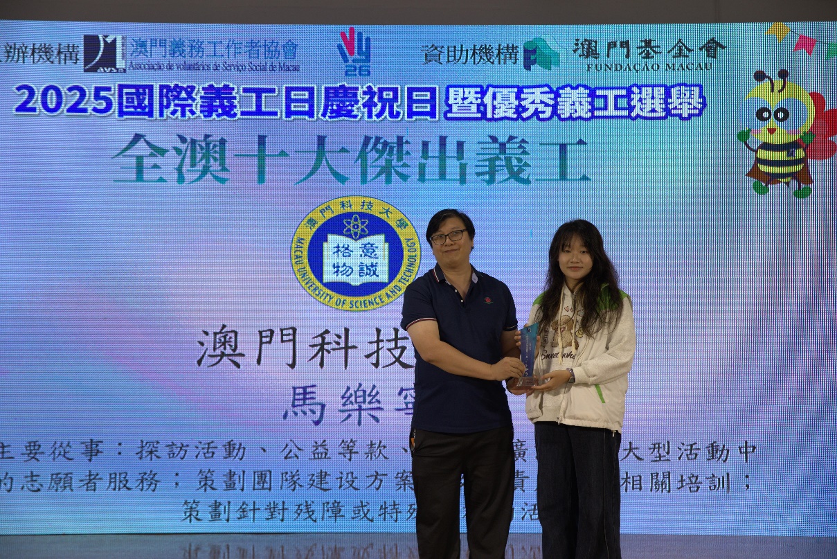 由澳门义务工作者协会主办的「2025国际义工日暨优秀义工颁奖礼」于12月7日在氹仔菩提社会服务大楼多功能厅举行,澳门科技大学学生事务处黄嘉颖处长应邀出席活动。澳门科技大学学生事务处辖下社会服务队马乐宁副队长荣获「全澳十大杰出义工」奖,队员刘美彤获澳门义工奖励计划「卓越星级义工」奖。