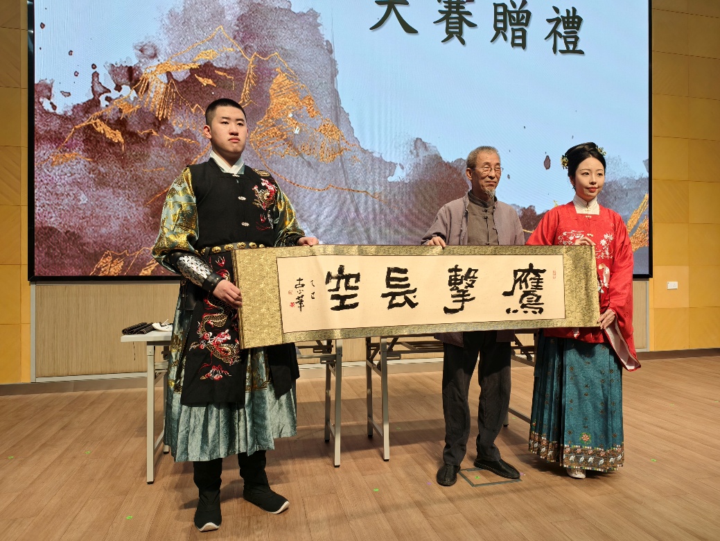 本次大赛特邀澳门科技大学学生事务处职务主管谭洁玲、文娱社团负责人凌飞扬导师,以及学生会理事长汪子夏莅临现场。同时,澳门书法家协会主席龚宝美、荣誉会长伦永燊、澳门山水画会主席古少华,以及澳门书法教育研究会理事黎珂君担任嘉宾评委,全程参与评审工作。澳门山水画会古少华主席更现场挥毫,题写「鹰击长空」四个苍劲有力的大字,以此鼓励青年学子当立鸿鹄之志,勇于搏击长空,在新时代的广阔天地中自强不息、展翅翱翔。题字仪式为比赛拉开精彩序幕,现场墨香四溢,掌声雷动。