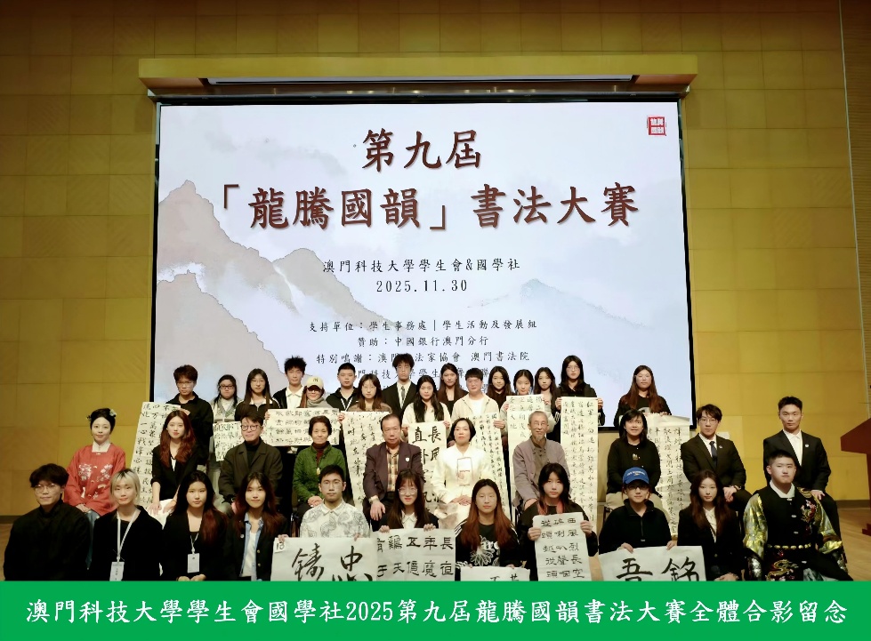 为弘扬中华优秀传统文化,坚定文化自信,并深切铭记中国人民抗日战争胜利八十周年的伟大历史,凝聚新时代青年奋进力量,2025年11月30日下午,澳门科技大学学生会国学社品牌活动「第九届龙腾国韵书法大赛决赛」在澳门科技大学N座101礼堂隆重举行。大赛以书法为媒,引领青年学子在笔墨间追溯烽火岁月,传承民族精神,于横竖撇捺中涵养家国情怀,赓续文化基因。