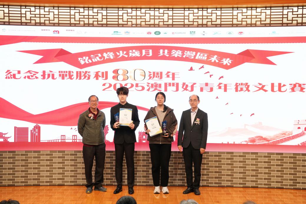 由澳門南海海外留學生聯盟暨南海青年聯會主辦,澳門南海同鄉會協辦,澳門佛山社團總會、佛山市政協(各級)歷屆澳門委員聯誼會、澳門中華教育會等多家單位支持的《銘記烽火歲月,共築灣區未來-紀念抗戰勝利80週年2025澳門好青年徵文比賽》頒獎禮,於1月24日上午在青少年愛國愛澳教育基地二樓神州光影館隆重舉行。澳門科技大學酒店與旅遊管理學院的馮浩軒同學憑作品《又見玉蘭》榮獲大學組銀獎,學生事務處凌飛揚導師應邀出席頒獎禮。