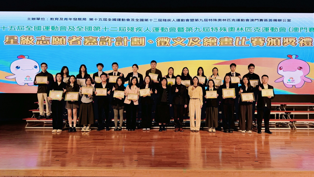 澳科大學子於賽事期間承擔多項前線支援與協調工作,以專業、熱情、細緻的服務,助力賽事順利進行,贏得了多方讚譽。在「星級志願者嘉許計劃」中,共29名學生獲得表彰,包括金獎3名、銀獎9名及銅獎17名。在徵文比賽澳科大學子同樣表現優異。賽事大學組共設40個獎項,我校共15名學生獲獎,其中一等獎1名、二等獎2名、三等獎3名、優異獎3名及入圍獎6名,他們通過細膩的筆觸,生動表達了對體育精神、人文關懷與社會共融的深刻理解與真摯感悟。