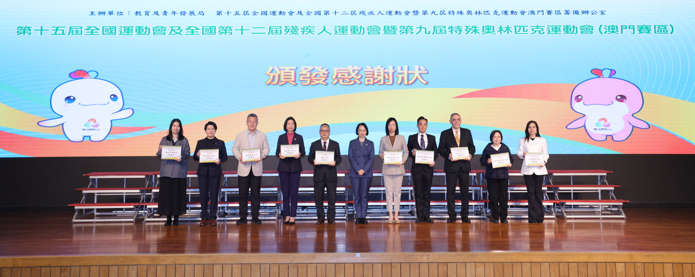 教育及青年發展局與十五運會及殘特奧會澳門賽區籌備辦公室於1月29日在教業中學舉行「星級志願者嘉許計劃」、徵文比賽及繪畫比賽頒獎禮,以表彰表現優異的志願者以及兩項比賽的得獎學生。澳門科技大學29名學生榮獲星級志願者金獎、銀獎和銅獎;15名學生獲得徵文比賽一等獎、二等獎和三等獎的優異成績。主辦單位為感謝高等院校、學校和社團機構對十五運會和殘特奧會組織志願者服務的支持,邀請了社會文化司柯嵐司長、教青局龔志明局長、全運辦潘永權主任等嘉賓向支持單位致送感謝狀,澳科大學生事務處黃嘉穎處長代表接受,同行出席還有學生事務處譚潔玲職務主管和何婉嫻導師。