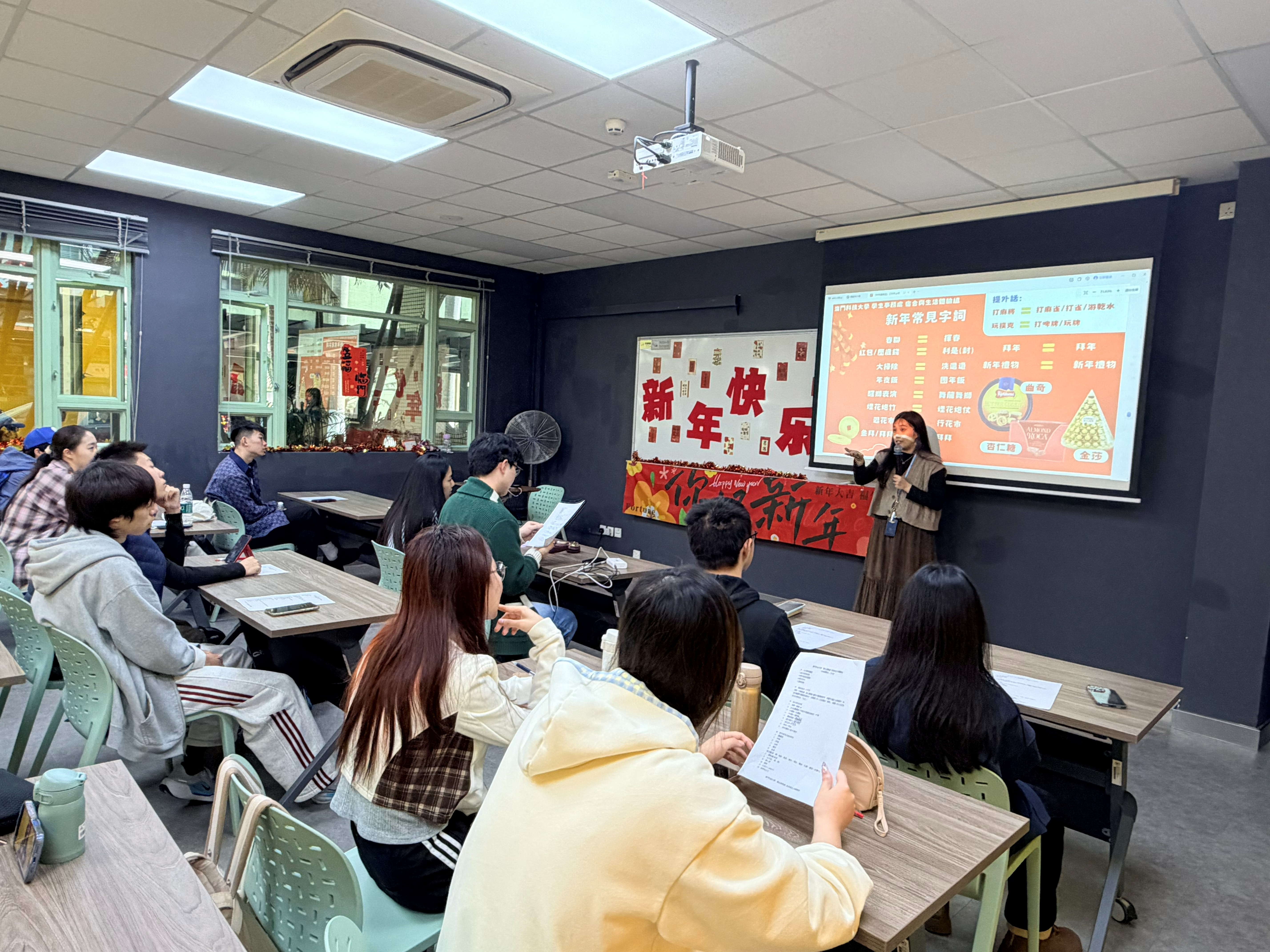 为让住宿生通过学习广东话的特色新年词汇,进一步认识广东新春习俗与文化、增进对本地社会文化的了解,并促进室友之间的交流互动,学生事务处宿舍与生活体验组于2026年2月4日及6日举办了两场「年味广东话」工作坊,吸引住宿生踊跃参与。现场洋溢着浓厚的年节气氛,住宿生在轻松活泼的氛围中积极投入,学习各式新年祝福用语。