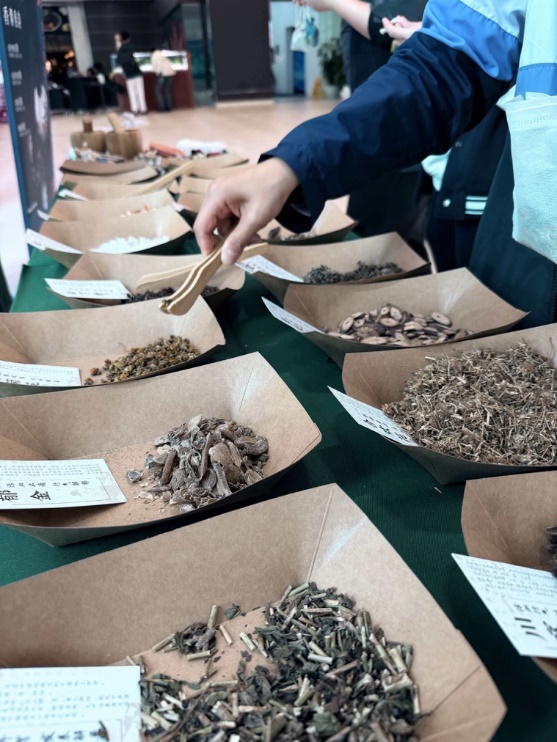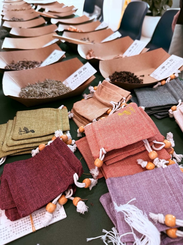 本次摊位共设置四大体验环节:参与者先挑选心仪香囊款式,再按配方自主抓取药材,随后亲手捣制药材释放本草香气,最后装入囊袋拉紧抽绳完成手作。从选材到成型的沉浸式体验,让师生在动手过程中感受中医药文化的独特魅力。