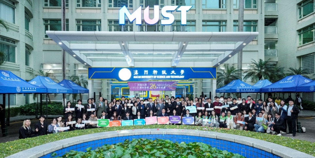 为庆祝澳门科技大学迎来26周年校庆,大学于3月2日下午在行政大楼前举行校庆启动仪式。澳科大校长朱健康,副校长唐嘉乐,硕士校友林通,教学杰出奖得奖教师肖玄玄副教授和尤舒翔助理教授,以及学生会主席孙潇珂担任主礼嘉宾,大学一众管理层与师生齐聚一堂,共同见证校庆月正式展开。