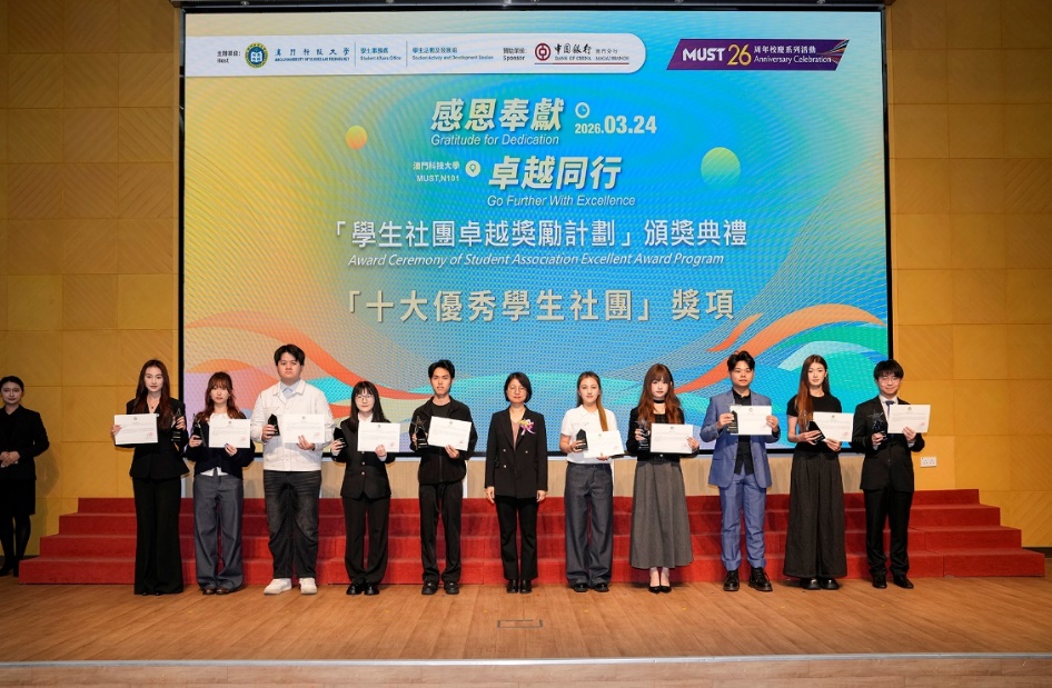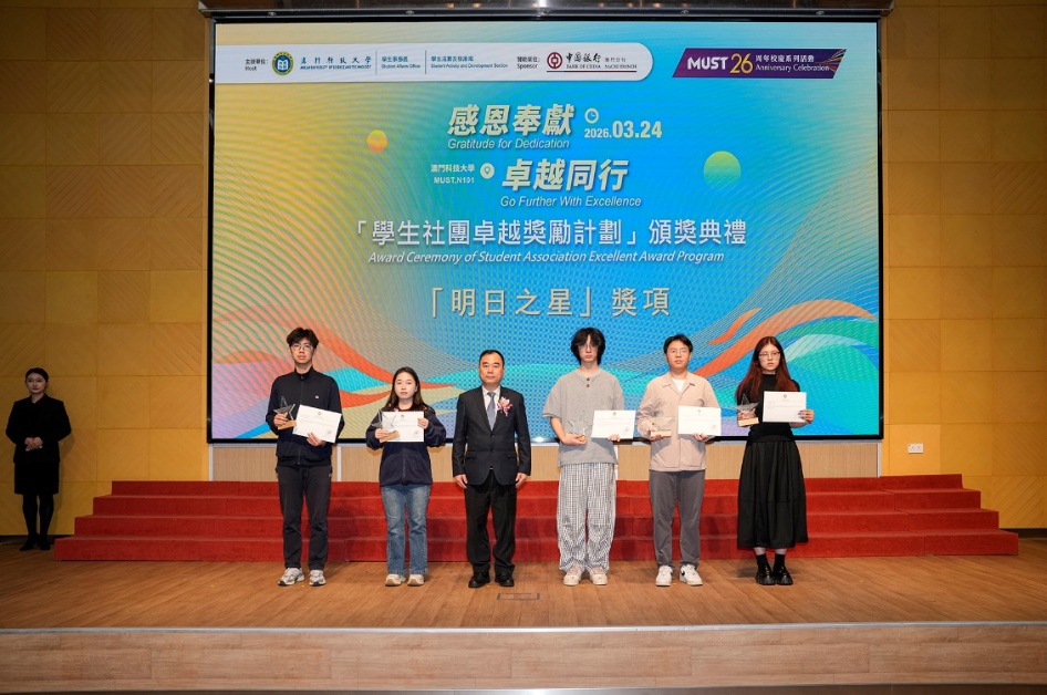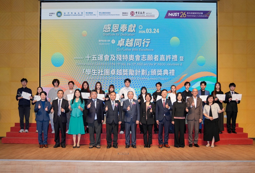 由澳门科技大学学生事务处主办的 “感恩奉献・卓越同行”—— 十五运会及残特奥会志愿者嘉许礼暨「学生社团卓越奖励计划」颁奖典礼于2026年3月24日下午在 N101礼堂举行。活动旨在表彰在十五运会及残特奥会中倾情奉献的志愿者们,以及在校园文化建设中表现杰出的学生社团,彰显科大学子的责任担当与青春风采。中联办教育和青年部岑嘉仪处长,教青局陈旭伟代副局长,中国银行澳门分行澳科大支行陈伟斌行长,澳门科技大学副校长邝应华博士、副校长兼药学院院长朱依谆讲座教授、协理副校长兼博雅学院院长梁文慧教授、协理副校长兼法学院院长方泉教授、中医药学院院长孙志广教授、酒店与旅游管理学院院长吴国民教授、学生事务处处长黄嘉颖博士、谭洁玲职务主管等出席典礼,共同见证这一荣耀时刻。