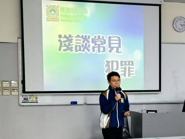 為提升學生的遵紀守法意識,加強正向校園氛圍,學生事務處邀請澳門司法警察局關注少年科人員到校,為學生進行「淺談常見犯罪類型」防罪教育講座,結合真實案例講解偽造文件、造成火警、吸食電子煙或毒品、打鬥傷人、洩露他人隱私、詐騙等各類違法行為的刑法規定,加強學生的守法意識。
